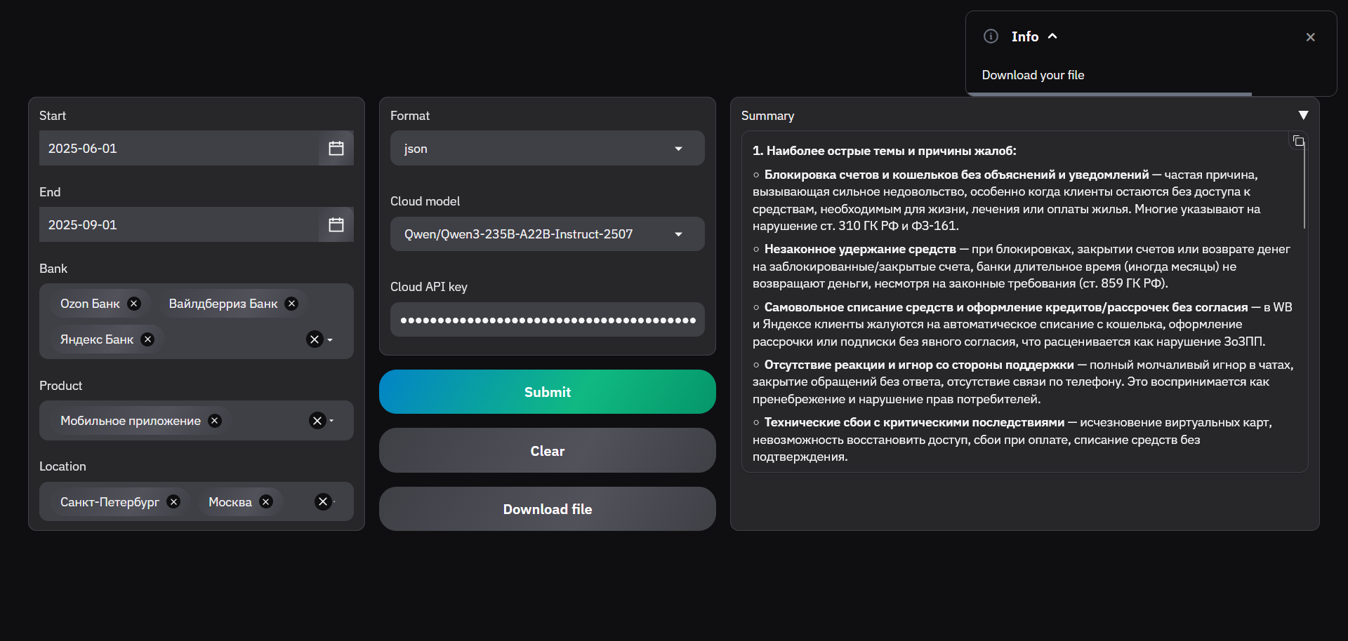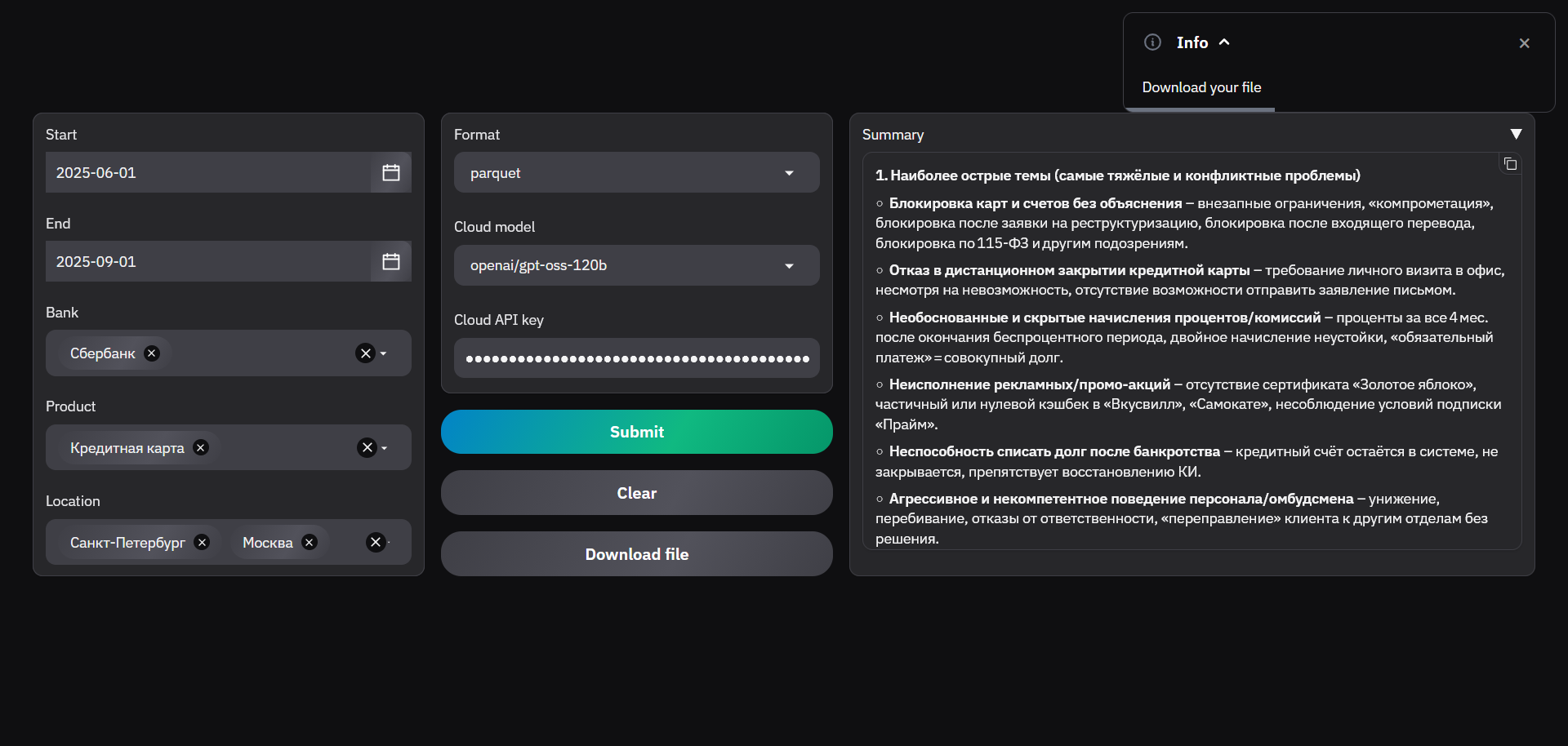 /d/git/bankiru-dbapi (main) $ http GET localhost:1706/reviews \ > outputFormat==abc HTTP/1.1 422 Unprocessable Content content-length: 197 content-type: application/json date: Thu, 14 Aug 2025 08:09:54 GMT server: uvicorn { "detail": [ { "ctx": { "expected": "'csv', 'json', 'parquet' or 'xlsx'" }, "input": "abc", "loc": [ "query", "outputFormat" ], "msg": "Input should be 'csv', 'json', 'parquet' or 'xlsx'", "type": "literal_error" } ] }Здесь используется симпатичный мне подход “бесшовной валидации”. Новые обработчики, конвертирующие выборку из БД в тот или иной формат, пишутся как потомки базового абстрактного класса. В момент выполнения кода