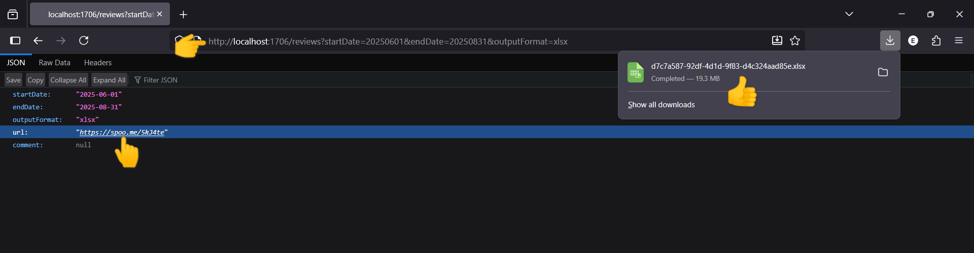 Чтение записей. Отзывы за первую неделю августа 2025 в xlsx. Ссылка валидна ограниченное время. Ответ200 OK./d/git/bankiru-dbapi (main) $ http GET localhost:1706/reviews \ > startDate==20250801 endDate==20250807 outputFormat==xlsx \ > --format-options json.sort_keys:false HTTP/1.1 200 OK content-length: 136 content-type: application/json date: Thu, 14 Aug 2025 07:58:48 GMT server: uvicorn { "startDate": "2025-08-01", "endDate": "2025-08-07", "outputFormat": "xlsx", "generateUrl": true, "url": "https://spoo.me/dv7ta3", "comment": null }То же в HTTPie desktop: