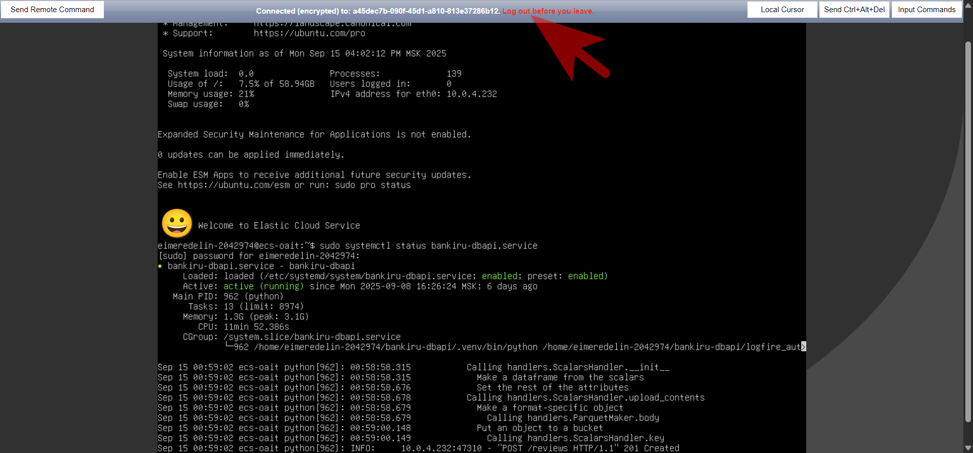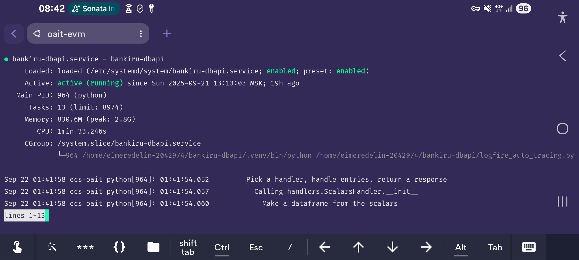 evm@ecs-evm:~$ sudo systemctl status bankiru-dbapi.service ● bankiru-dbapi.service - bankiru-dbapi Loaded: loaded (/etc/systemd/system/bankiru-dbapi.service; enabled; preset: enabled) Active: active (running) since Wed 2025-08-13 21:17:43 MSK; 4s ago Main PID: 34936 (python) Tasks: 11 (limit: 4144) Memory: 124.8M (peak: 125.2M) CPU: 1.849s CGroup: /system.slice/bankiru-dbapi.service └─34936 /home/evm/bankiru-dbapi/.venv/bin/python /home/evm/bankiru-dbapi/logfire_auto_tracing.py Aug 13 21:17:43 ecs-evm systemd[1]: Started bankiru-dbapi.service - bankiru-dbapi. Aug 13 21:17:43 ecs-evm python[34936]: Logfire project URL: https://logfire-us.pydantic.dev/... Aug 13 21:17:44 ecs-evm python[34936]: INFO: Started server process [34936] Aug 13 21:17:44 ecs-evm python[34936]: INFO: Waiting for application startup. Aug 13 21:17:44 ecs-evm python[34936]: INFO: Application startup complete. Aug 13 21:17:44 ecs-evm python[34936]: INFO: Uvicorn running on http://... (Press CTRL+C to quit)Выход: