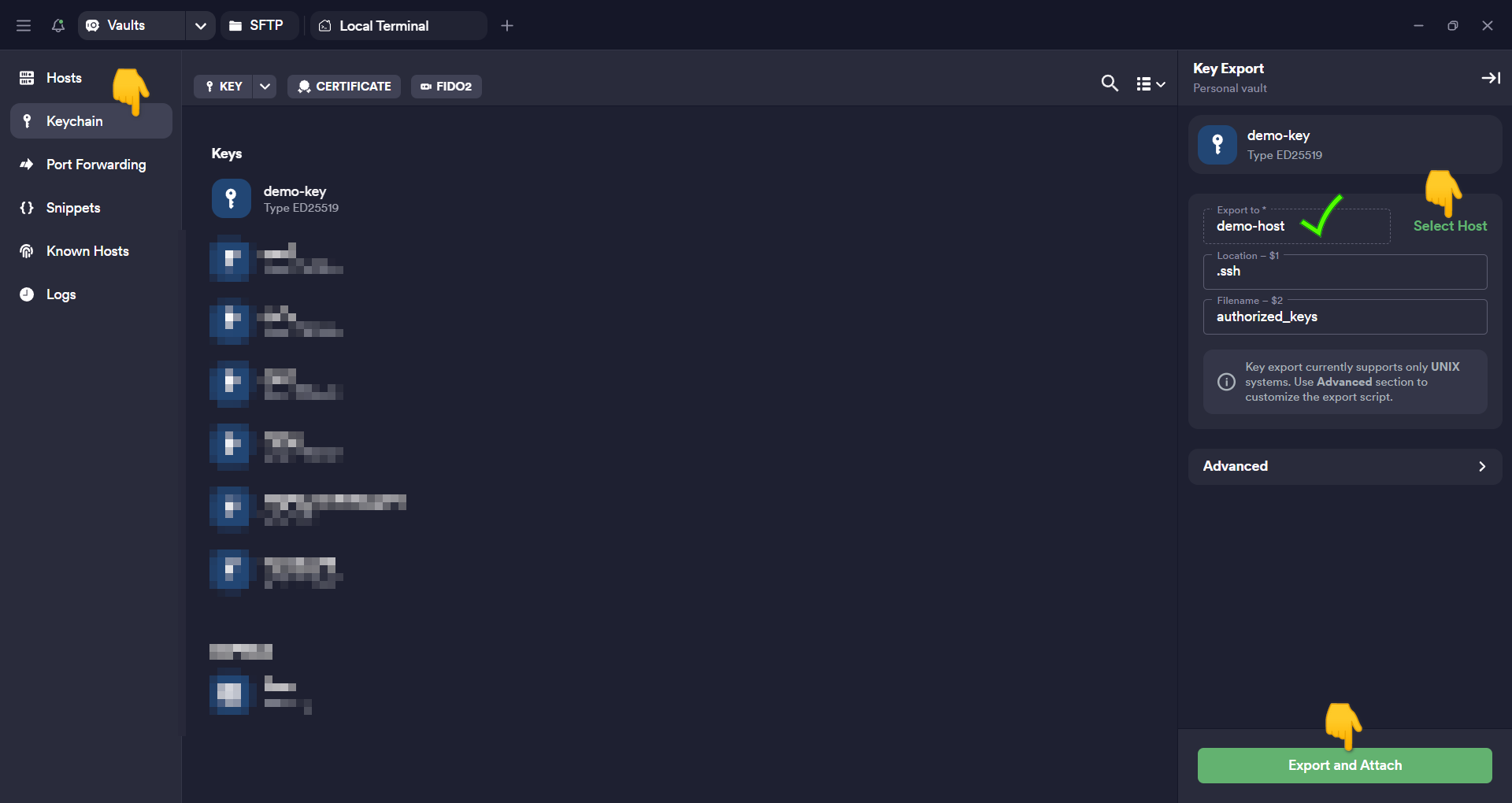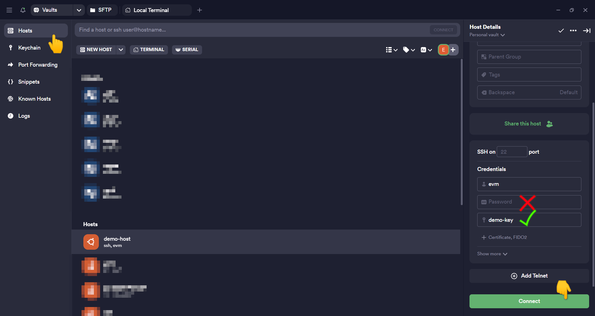 $ ssh user-demo@188.72.107.76 Enter passphrase for key '/c/Users/user/.ssh/id_ed25519': Welcome to Ubuntu 24.04.2 LTS (GNU/Linux 6.8.0-71-generic x86_64) * Documentation: https://help.ubuntu.com * Management: https://landscape.canonical.com * Support: https://ubuntu.com/pro System information as of Wed Jul 30 02:20:05 PM MSK 2025 System load: 0.0 Processes: 113 Usage of /: 8.6% of 39.26GB Users logged in: 0 Memory usage: 10% IPv4 address for eth0: 10.0.14.15 Swap usage: 0% Expanded Security Maintenance for Applications is not enabled. 0 updates can be applied immediately. Enable ESM Apps to receive additional future security updates. See https://ubuntu.com/esm or run: sudo pro status Welcome to Elastic Cloud ServiceЕще проще с Termius: