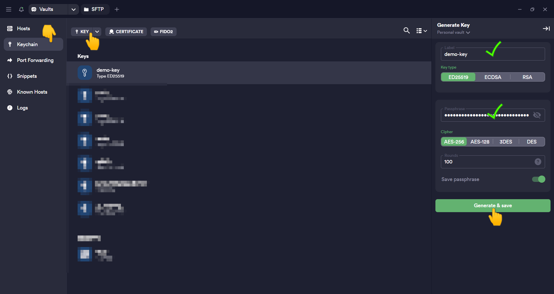 - Сгенерируйте пароль (passphrase) для SSH-ключа и сохраните его в надежном месте. Пожалуйста, не пренебрегайте созданием passphrase — он понадобится для подключения к серверу PostgreSQL. Например, создайте буквенно-цифровую последовательность длиной 50 символов этим генератором.