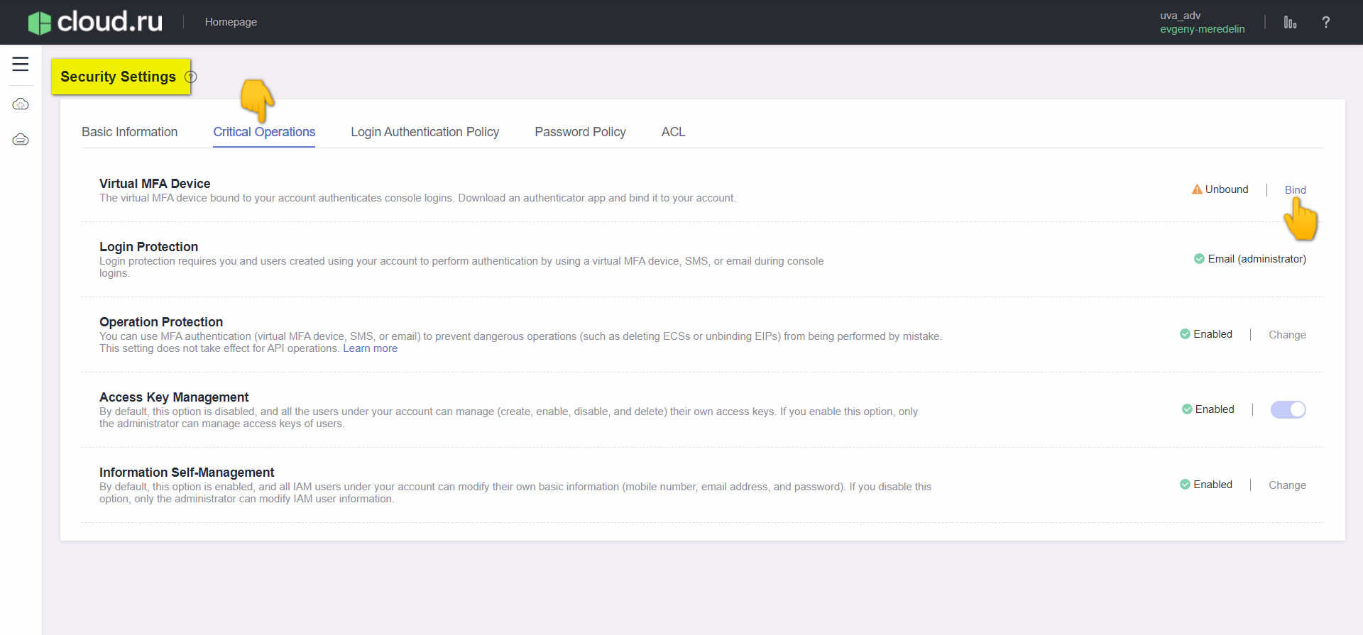 - Перейдите в настройки безопасности. Вход в консоль Cloud.ru Advanced осуществляется с помощью IAM username и IAM password.