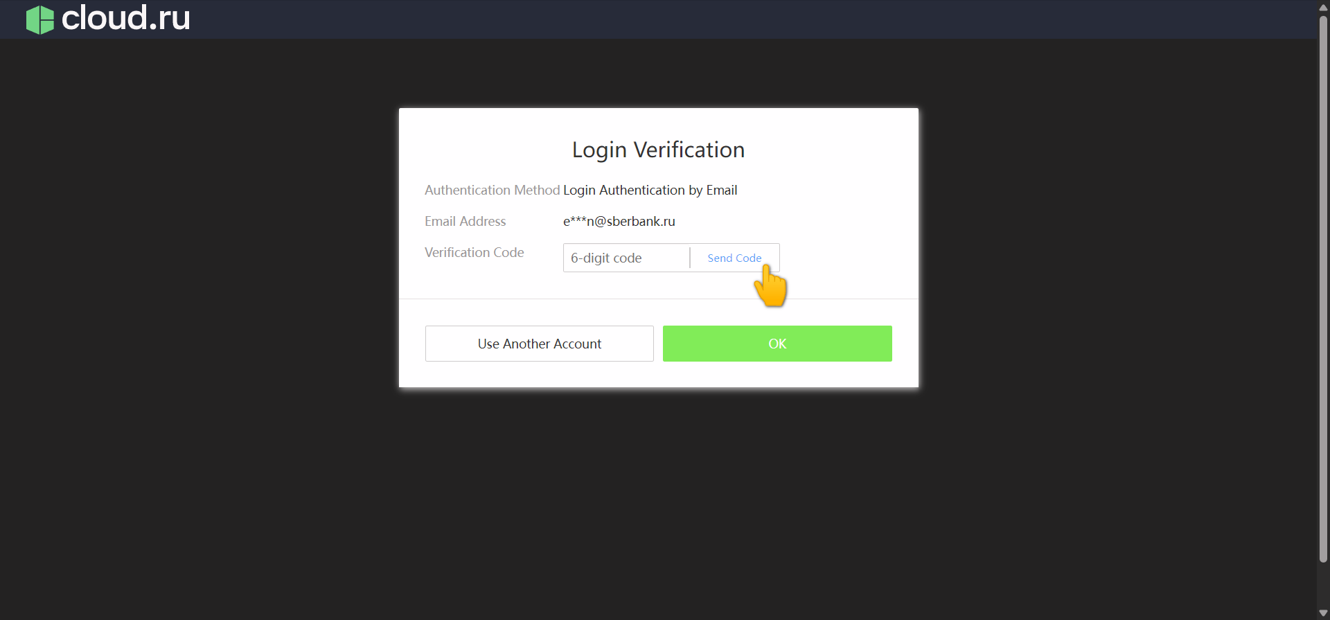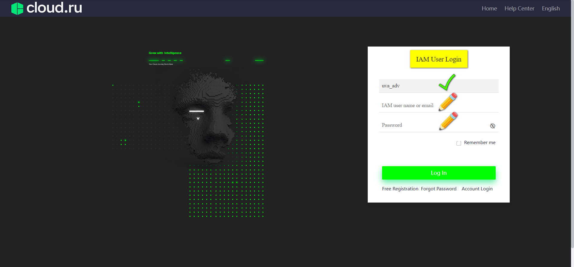 - Введите ваши IAM username и IAM password в консоли Cloud.ru Advanced.