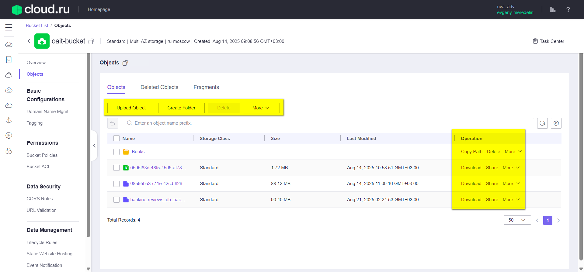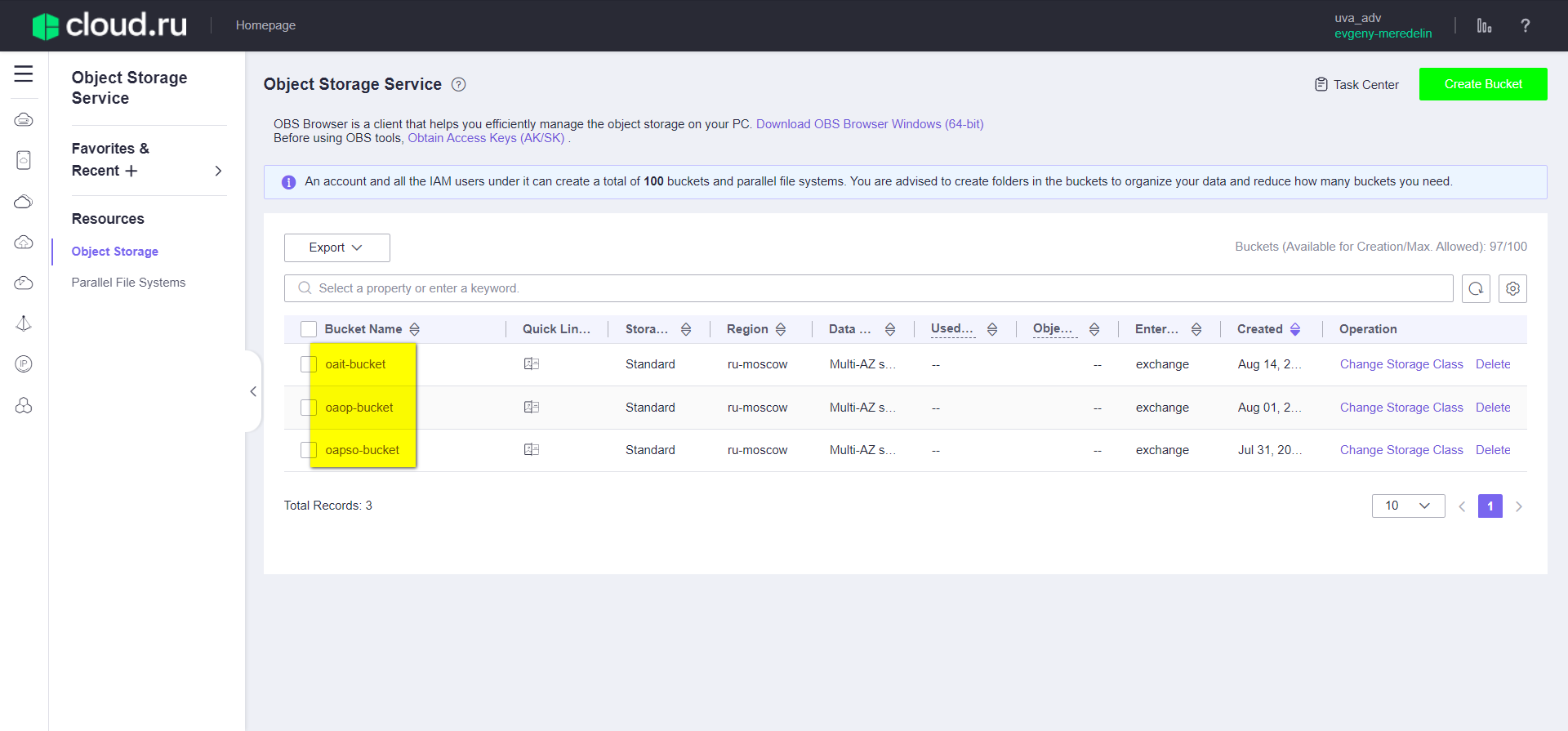 - Access key, secret key, endpoint и region (programmatic access — программный доступ) для управления объектами в бакете с помощью клиентов/интерфейсов объектных хранилищ и библиотек. Используется в пп.1-4 Подключение к объектному хранилищу.ℹ️