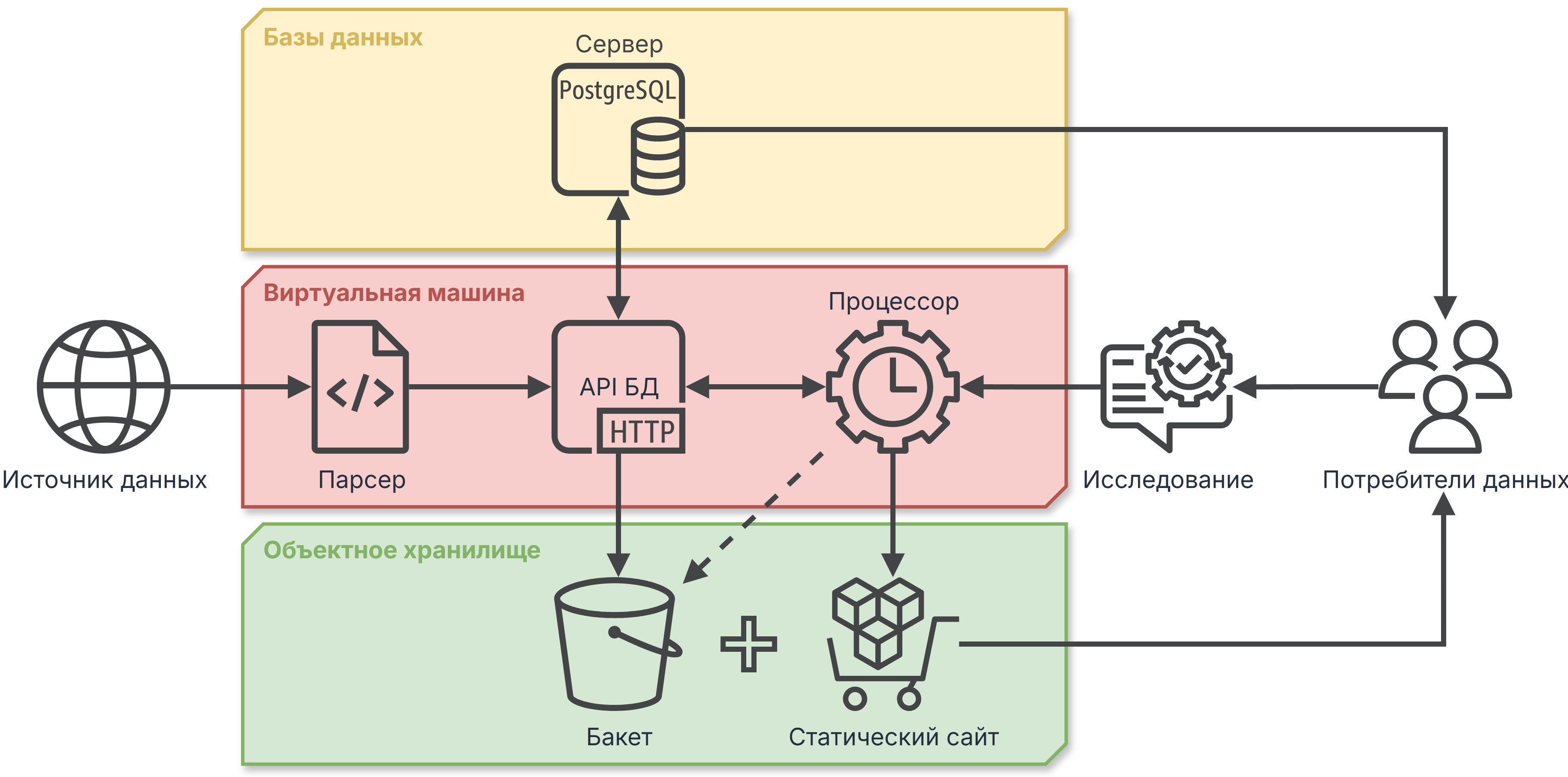 Парсер собирает сырые данные из источника и через API публикует их в базе данных, а API, после коммита, например, автоматически делает копию обновленной базы данных в бакете вашего отдела.